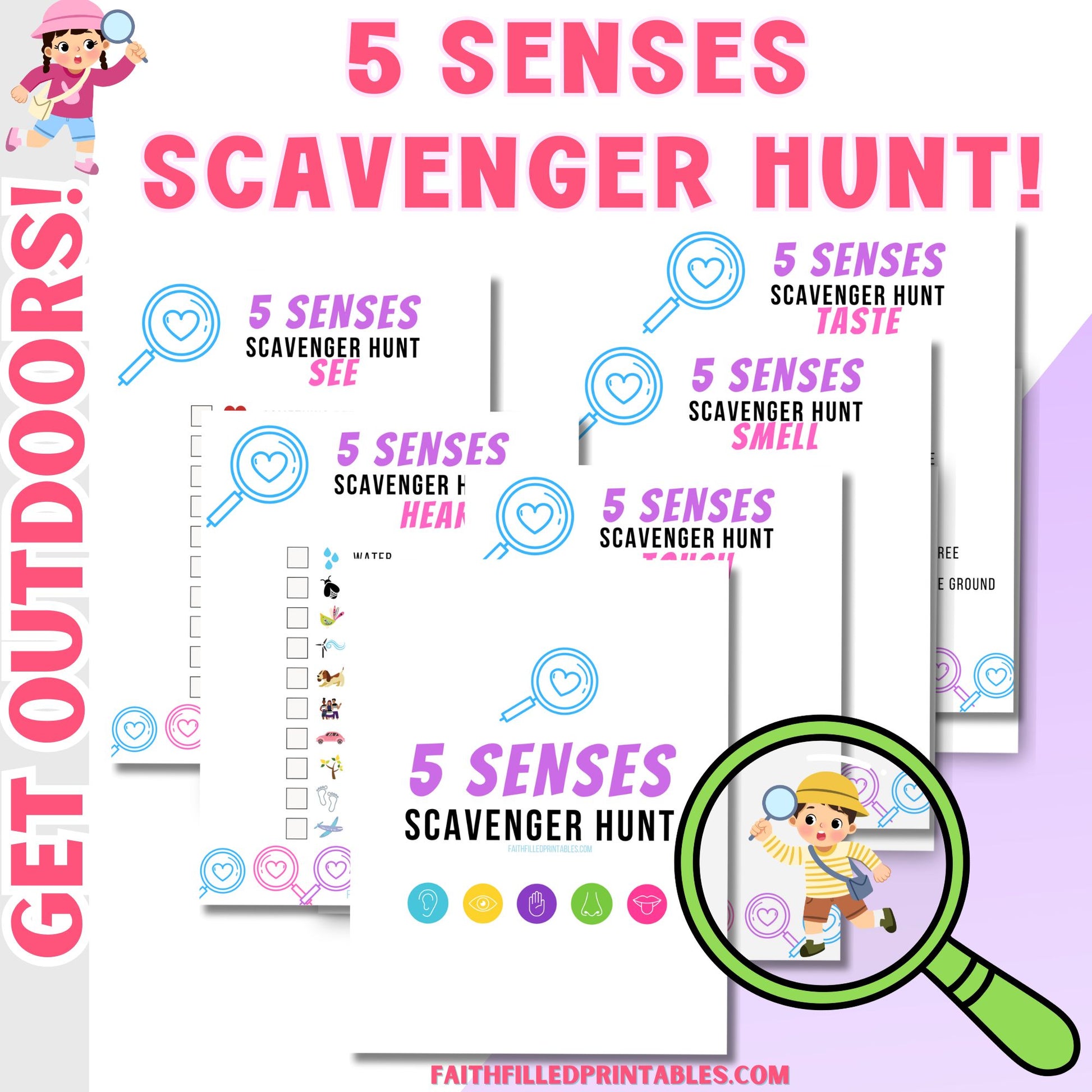 It's time to get outdoors with this FUN Outdoor 5 Senses Scavenger Hunt! This creative activity includes five dedicated hunting pages—one for each sense: sight, sound, touch, smell, and taste. Perfect for backyard adventures, nature walks, or park outings, this hunt encourages kids to explore their environment while developing sensory awareness through fun, interactive discovery. A great activity for keeping Preschoolers, Kindergarten and even older kids content, happy and learning!