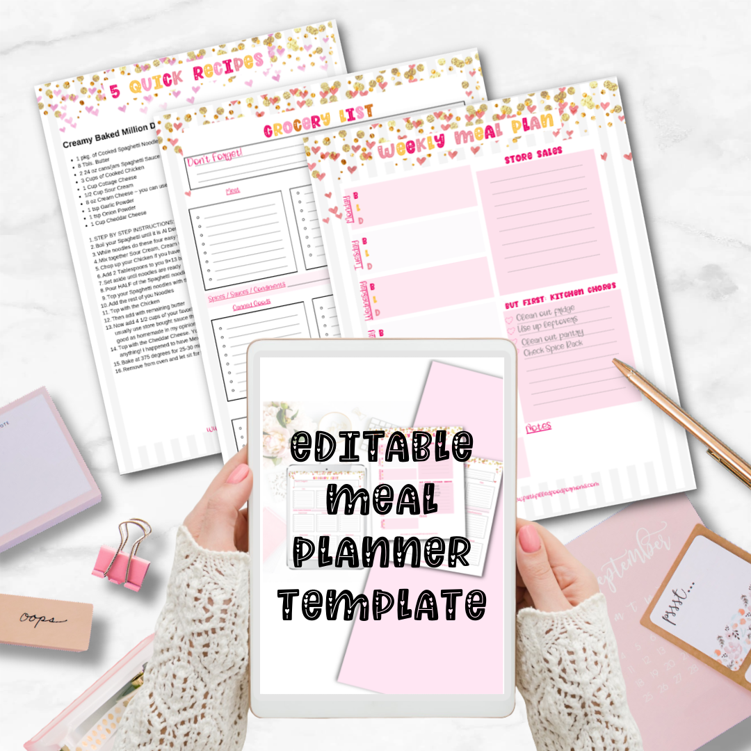 This super Cute Editable Meal Planner Template will make menu planning a whole lot easier! It is perfect for both printing and using online! There is also a Grocery List Planner that is editable! Add all your favorite meals once and print over and over again! I have added FIVE easy recipes from my website Faith Filled Food for Moms to get you started.